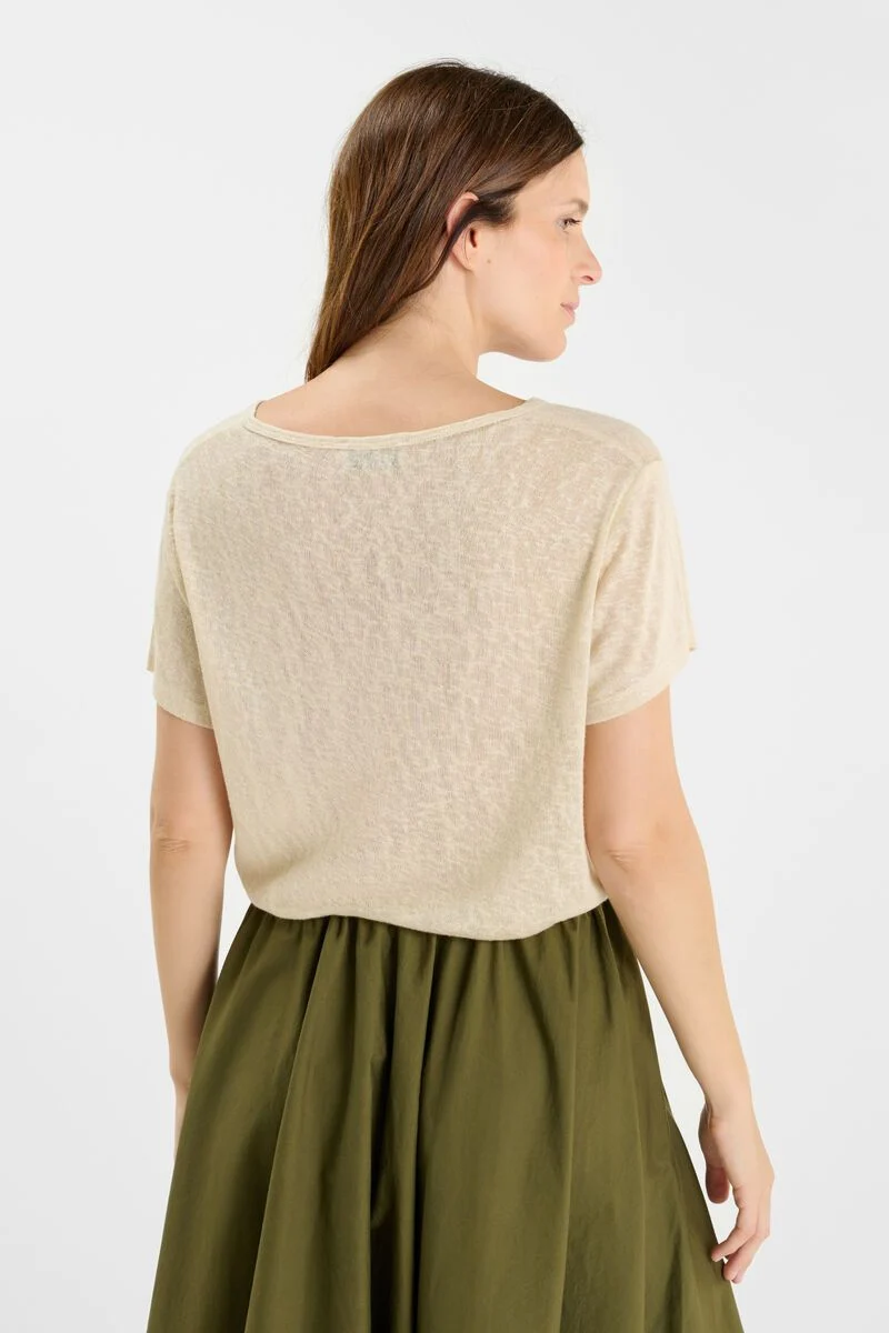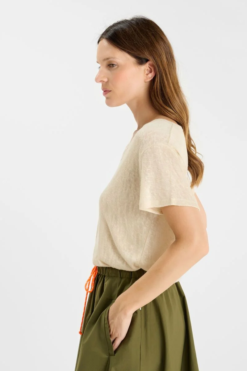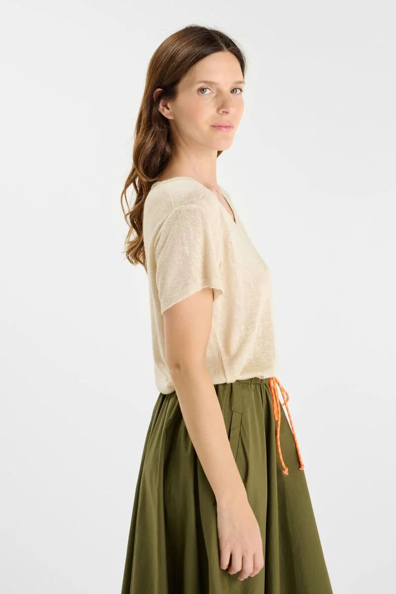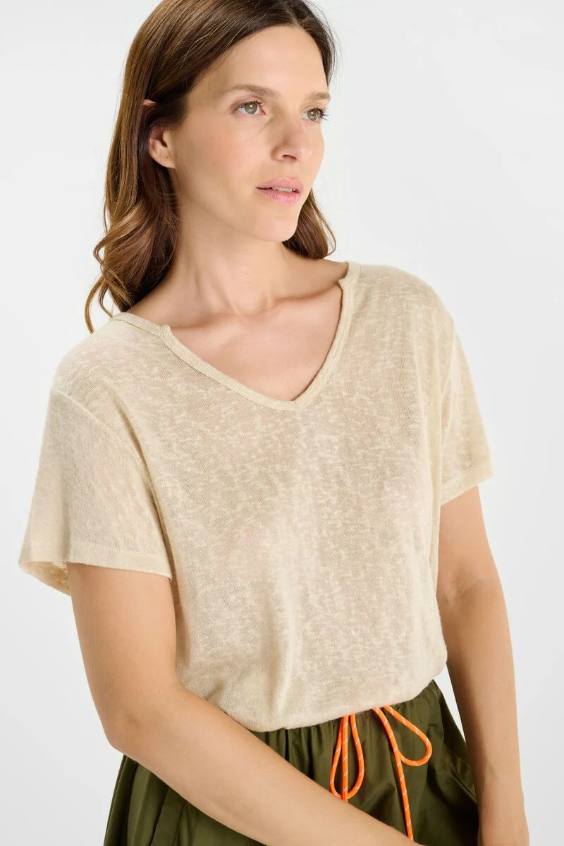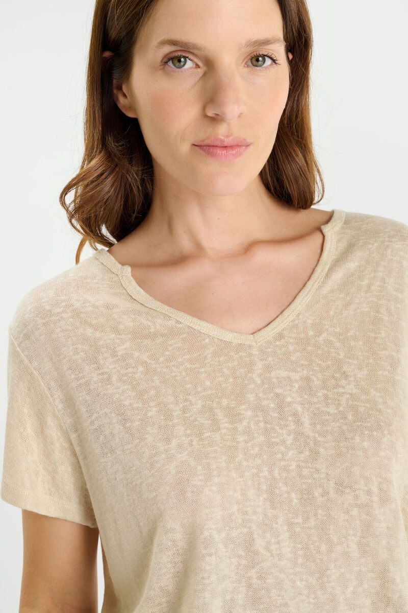 T-shirt beige col V aux manches courtes et Ă  l’effet brillant discret