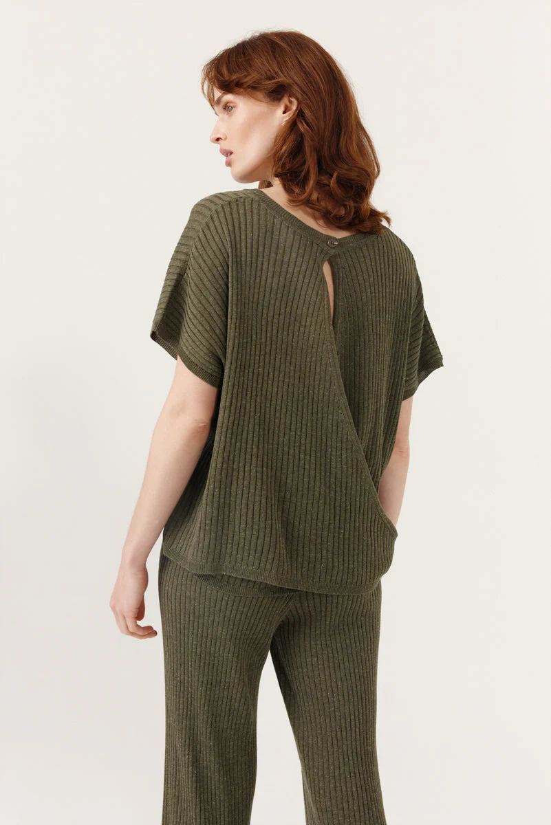 T-shirt maille côtelé kaki ouvert dans le dos